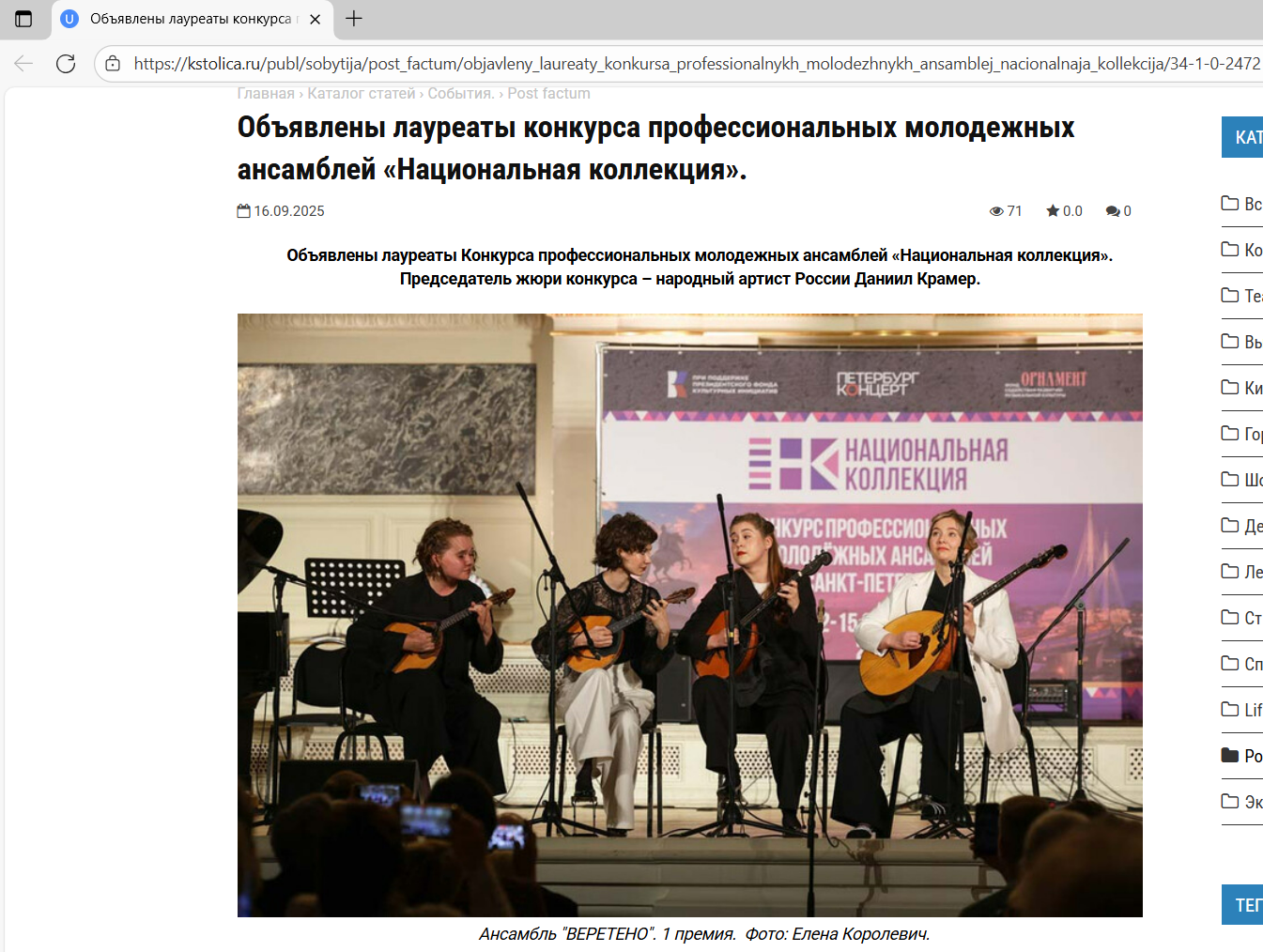 Ссылка на статью: nstar-spb.ru/kultura/obyavleny-laureaty-konkursa-professionalnyh-molodezhnyh-ansambley-natsionalnaya-kollektsiya.html