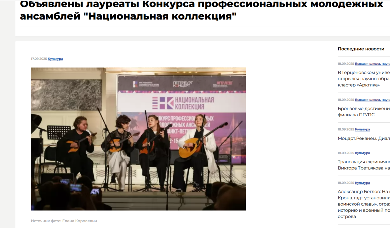 Ссылка на статью: nstar-spb.ru/kultura/obyavleny-laureaty-konkursa-professionalnyh-molodezhnyh-ansambley-natsionalnaya-kollektsiya.html